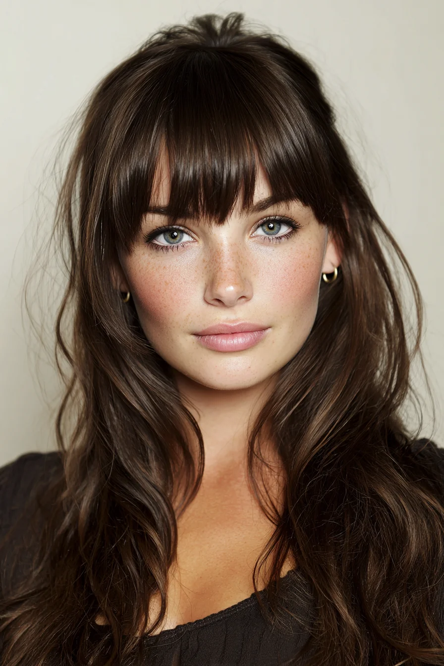 This look pairs long, face‑framing layers with a straight blunt fringe and gentle crown lift — ideal for shoulder‑to‑mid‑back lengths. It works best on medium to thick straight or wavy hair; fine hair can still achieve the shape with added texture or lightweight extensions for fullness. Cut: long layers with a blunt, eyebrow‑skimming fringe and subtle graduation at the crown. Style: apply heat protectant and a root‑lifting mousse to towel‑dried hair. Blow‑dry bangs straight with a small round brush and dry lengths with a large round brush for body. Create loose, alternating waves with a 1