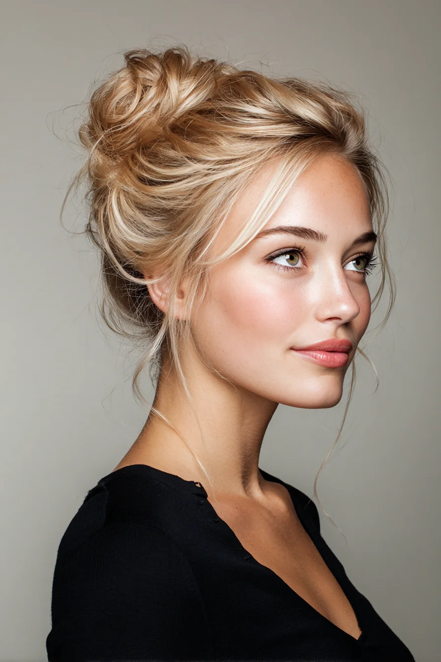 Loose Textured High Bun with Wispy Face‑Framing Layers