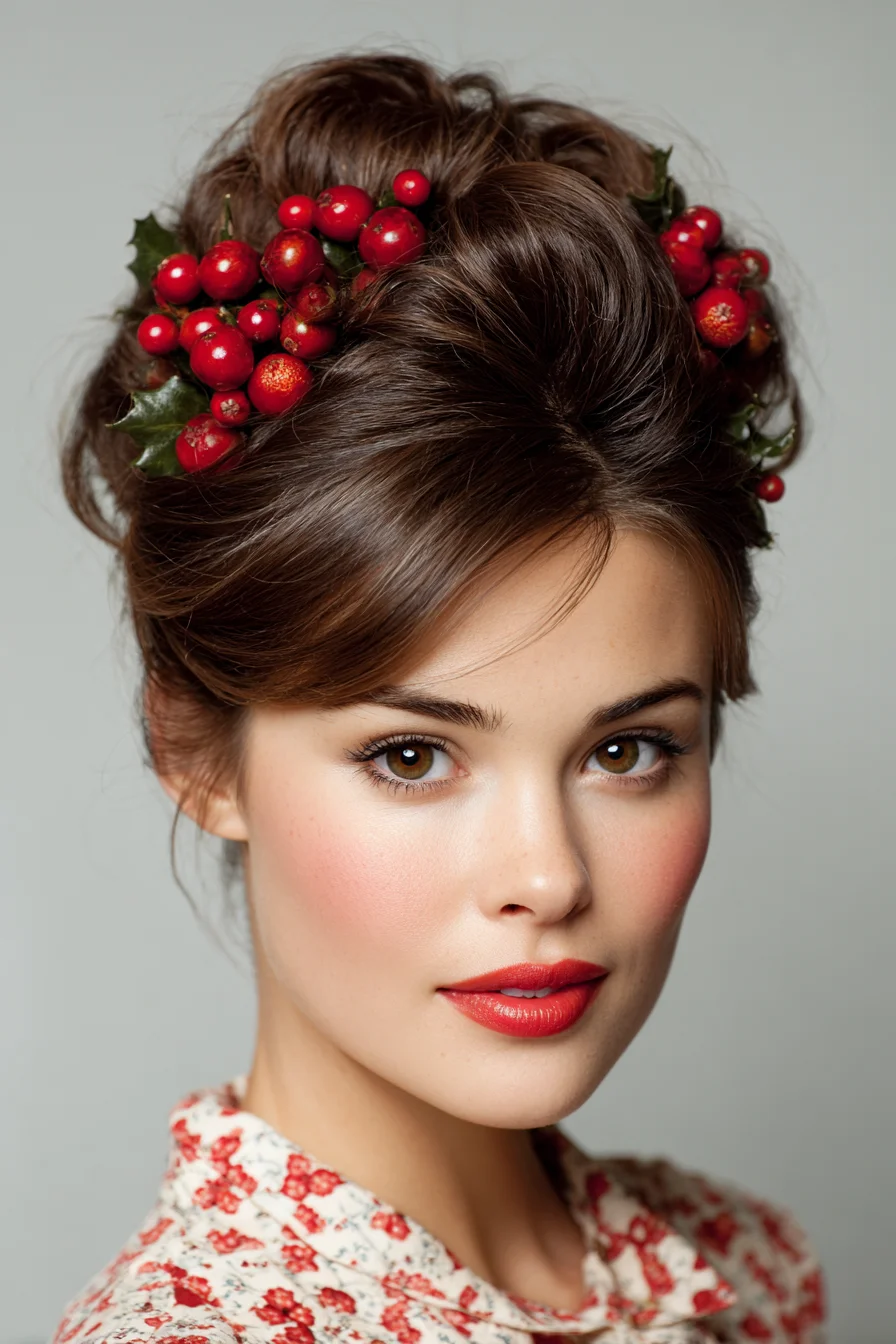 This romantic, voluminous bouffant updo works best on medium to thick hair; fine hair benefits from lightweight padding or clip-in pieces for lift. Start with freshly washed, towel-dried hair treated with a volumizing mousse and heat protectant. Blow-dry with a round brush to create root lift, then section the crown and gently backcomb at the roots to build a soft bouffant. Smooth the top layer without flattening the volume, gather hair into a loose high twist or roll, and secure with long pins and criss-crossed bobby pins. Add wired berry or floral picks into the sides and back, anchoring them to the hairpins rather than the hair shaft for security. Tools: round brush, tail comb, teasing brush, sectioning clips, medium-barrel curling iron, bobby pins, long U-pins, wire cutters. Products: volumizing mousse, root-lift spray, texturizing spray or dry shampoo, light-hold serum for flyaways, flexible-hold hairspray. Difficulty: medium–advanced; expect 30–60 minutes. Maintenance tips: sleep upright or re-pin any loosened pieces, refresh volume with dry shampoo, carry travel hairspray, and avoid heavy decorations that pull on the roots. For formal events, consider a stylist to ensure long-lasting structure.
