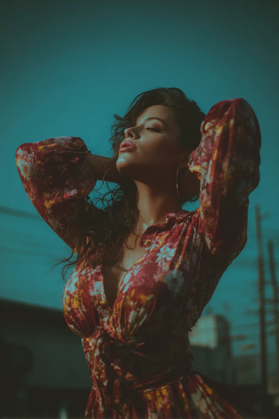 She tilts her face toward the sky, hands swept through dark, windswept hair, lost in the moment. The deep red floral wrap dress catches the warm light against a moody teal backdrop. Theres a raw, unhurried confidence in the way she holds herself.